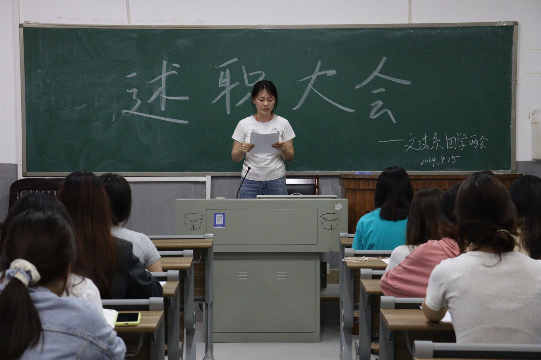 (记者 刘婉婷 尹诗茵 辜慧敏)4月15日晚,文法系团学两会在树达楼511教室召开述职大会。会议由文法系团总支青年发展工作部副部长秦明月主持。
