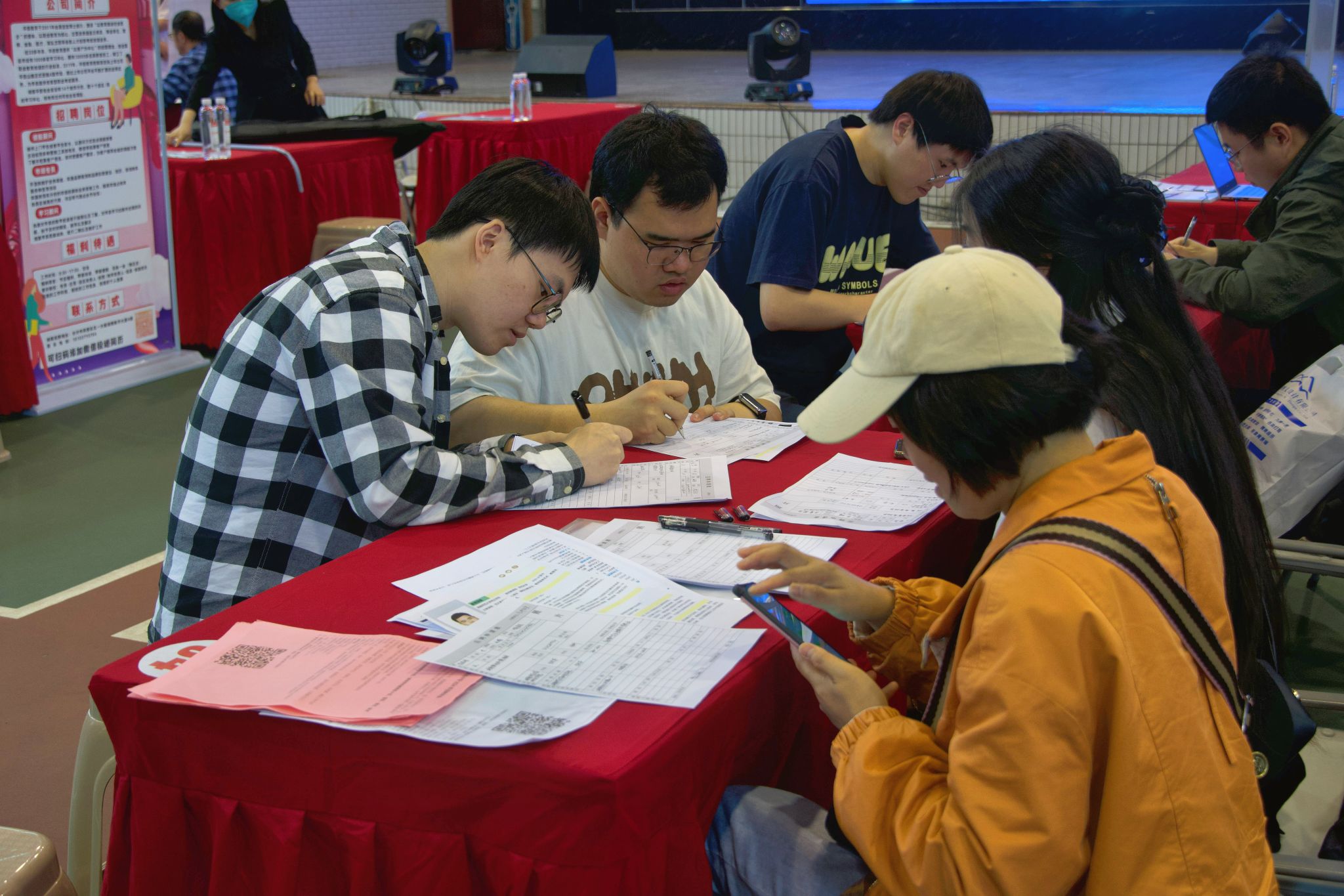 招聘会现场气氛热烈,应届毕业生向用人单位投递个人简历,用人单位向同学们介绍关于我们、未来发展方向、人员需求等方面情况。
