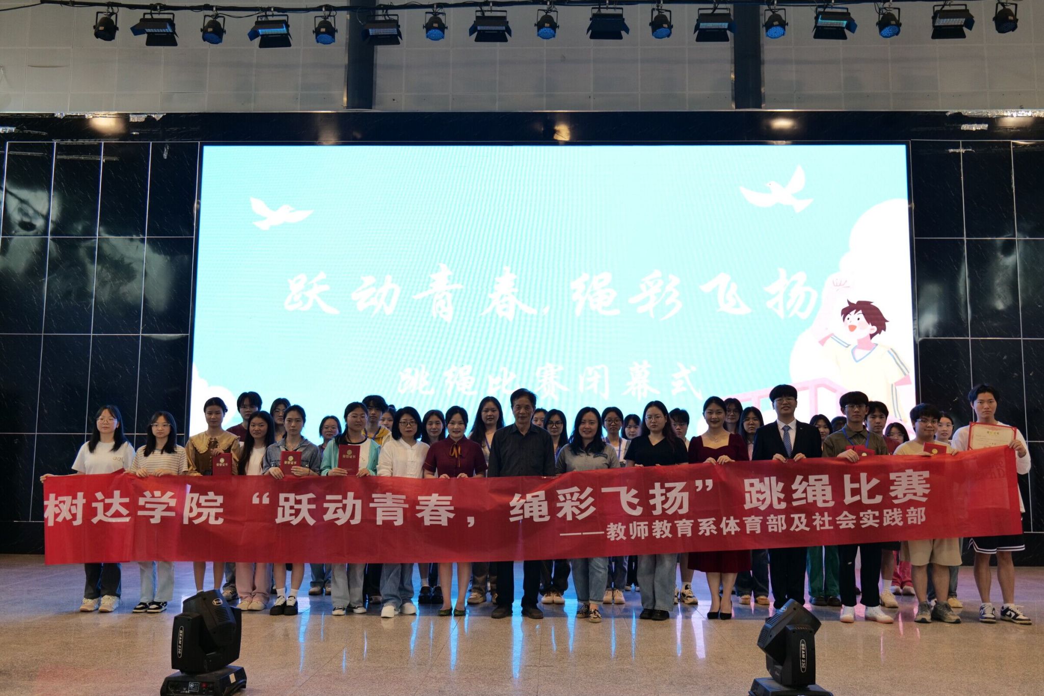 (记者 李皖湘 张铠 陈欣玉)4月26日中午,公司教师教育系在员工文体活动中心举办以“跃动青春,绳采飞扬”为主题的跳绳比赛闭幕式。教师教育系系主任刘顺保、教师教育系团总支书记熊椰、教师教育系教务办负责人肖沛颖、邓珂出席闭幕式。仪式由2022级播音与主持艺术专业一班向博慧、2022级地理科学专业一班余嘉程主持。