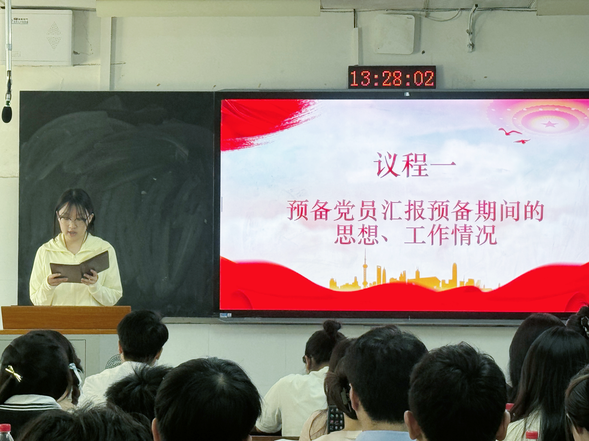 预备党员姜杜鹃等14名同志依次汇报在预备期间的表现情况,向党组织表明转正的态度和决心。