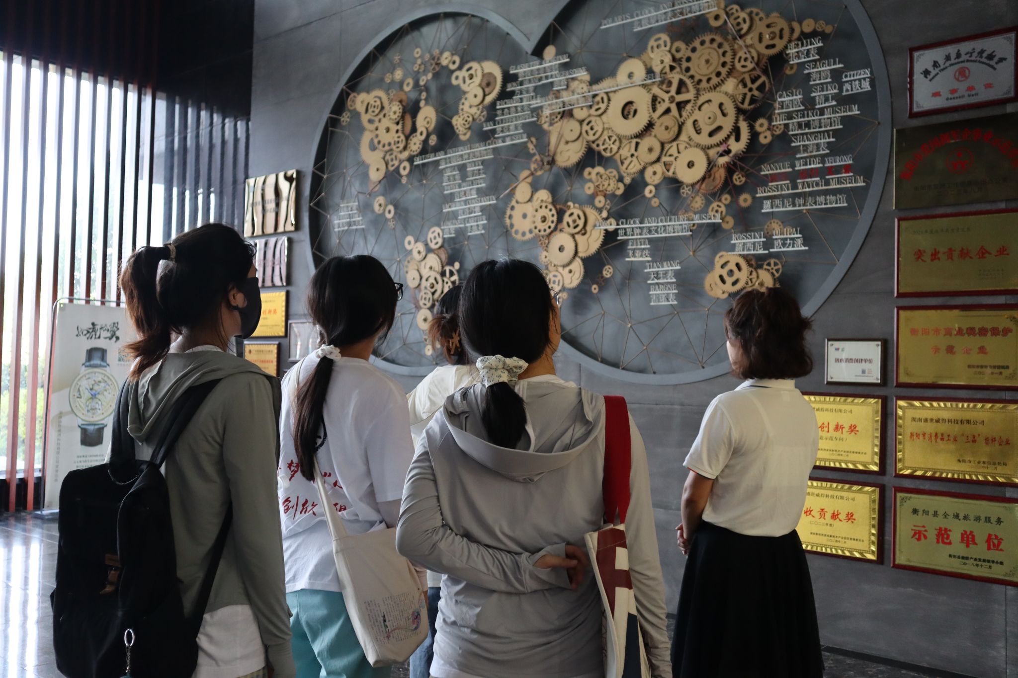 实践团成员们跟随着讲解员的脚步走进博物馆。该博物馆作为钟表文化的重要展示和解读中心,全方位地向参观者展现了钟表的发展历程,并利用3D全息投影技术展示了钟表的制作细节,还开设了多媒体活动体验区和DIY体验区,增强了大家的体验感和参与度,更加深入地了解衡阳县钟表产业的发展历史与进程。