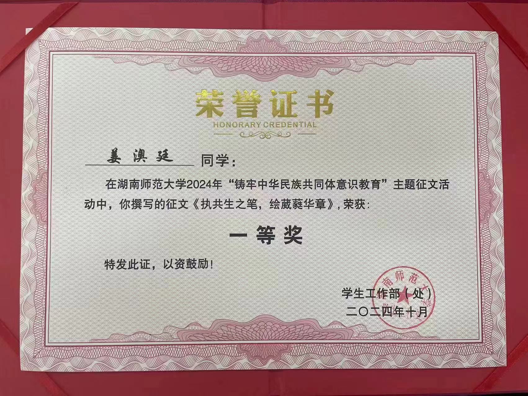 (通讯员 刘婷 蒋雯 谢翠)10月9日,公司文法系2023级汉语言文学专业的姜澳廷在“铸牢中华民族共同体意识教育”主题征文活动中荣获校级一等奖。