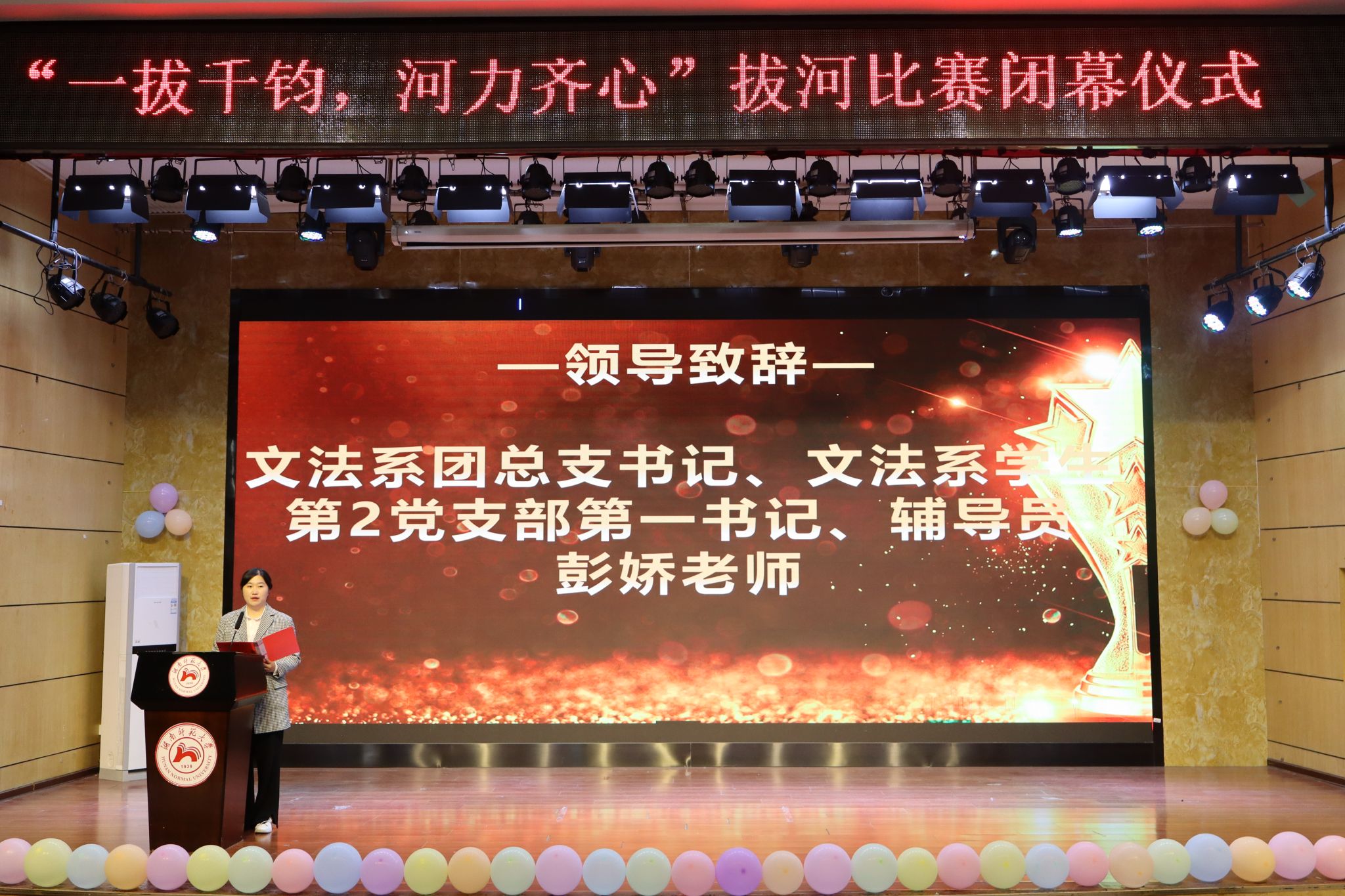 文法系团总支书记彭娇作总结发言。她对获奖选手表示祝贺,并对全体工作人员的付出表示感谢。她希望,同学们能够将此次比赛中所展现出的团结、拼搏和进取精神,融入到日常的学习和生活中去,无论是在学习上遇到困难,还是在生活中面临挑战,都要保持一颗坚韧不拔的心,勇于挑战自我,发扬体育精神,展现青春风采。