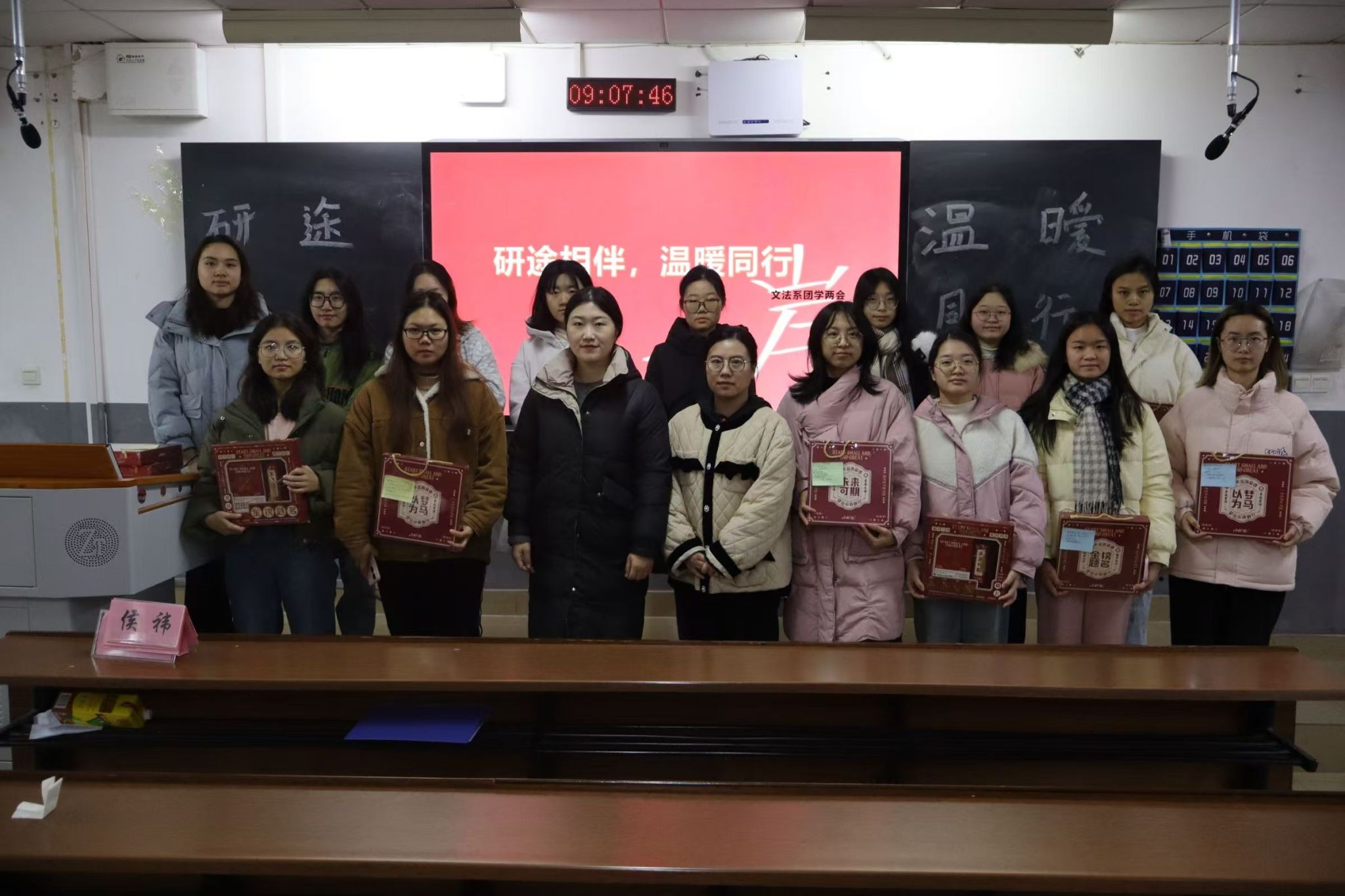 彭娇、侯祎为文法系全体考研学子送上考研礼盒和祝福,并激励学子们继续加油。