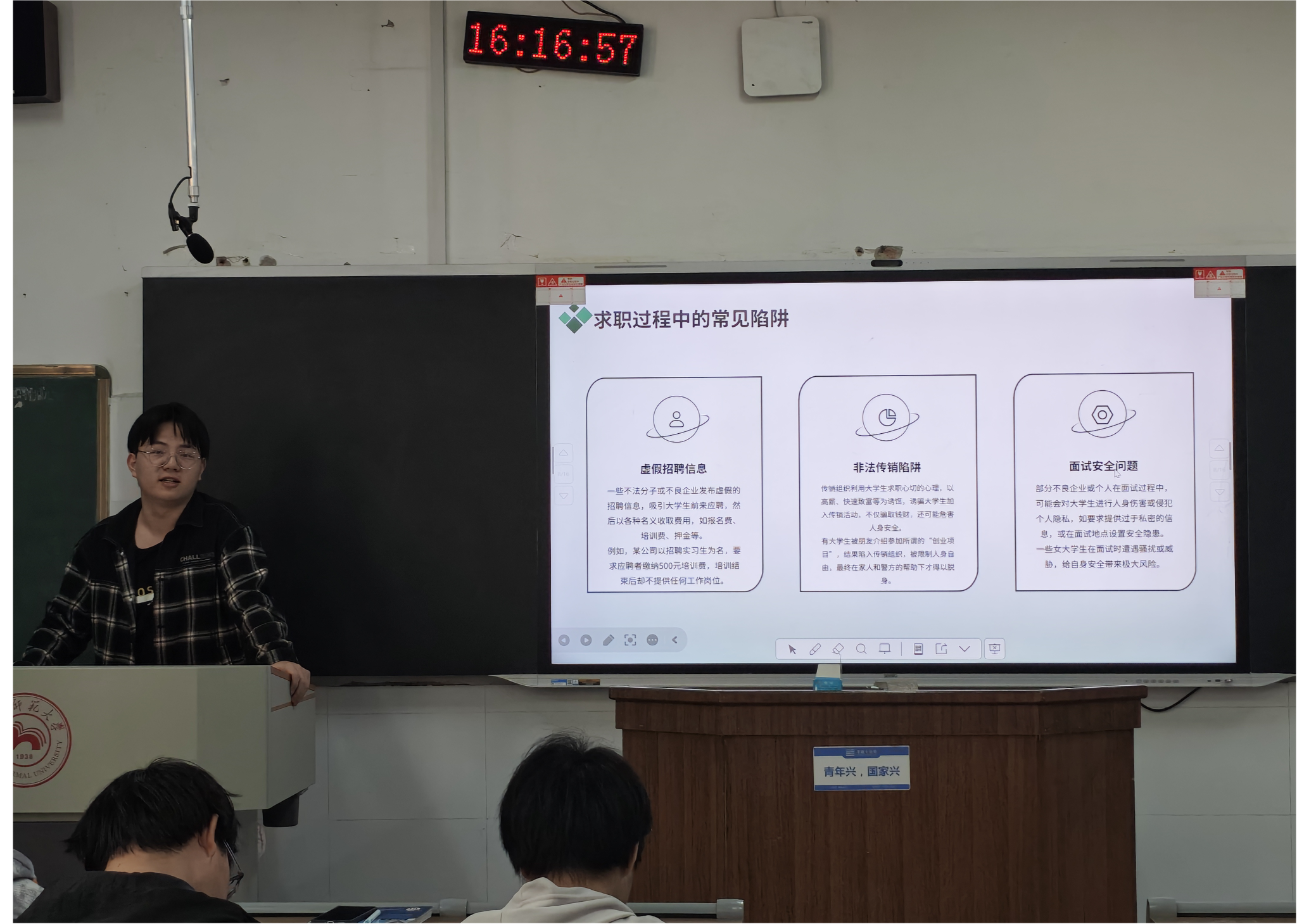 刘伟结合时政资料向同学们讲述了财产安全与个人信息安全的知识。他表示,同学们要强化风险防范意识,培养网络信息辨别能力,务必坚守“不轻信、不转账、不泄露”的三不原则。他希望,同学们能主动学习防诈知识技能,在生活中践行“三不”要求,共同构建校园防诈“防火墙”,为平安校园建设贡献力量。