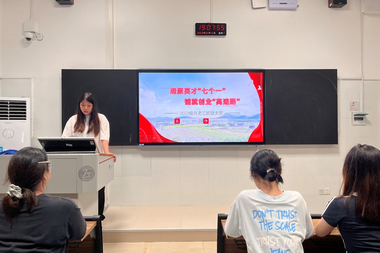 2023级物理学一班班长兼团支部副书记蒋雯聚焦湖南省委书记沈晓明提出的“七个一”政策,深度解析了政策红利,并组织团员们观看相关创新创业的案例视频。她强调,同学们应勇于创新,发掘自己的才华与潜力,传递积极向上的价值观和敢于追梦的精神。