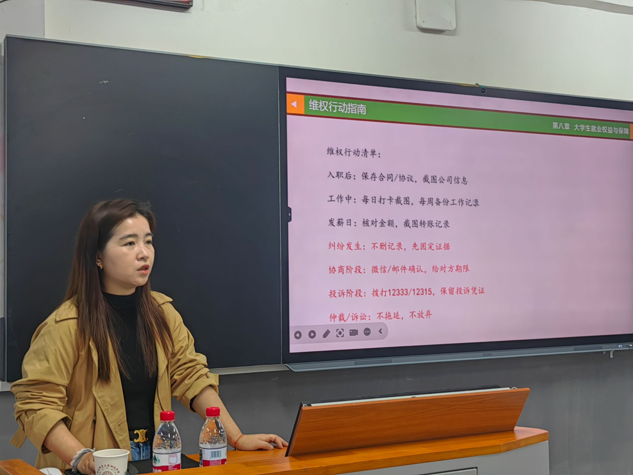 陈安琪结合自身专业优势与就业市场实际案例,围绕老员工兼职实习、求职就业两大核心场景,系统拆解了常见求职陷阱,详细讲解了录用通知(offer)、就业协议书、劳动合同三类协议的区别与风险,梳理了从固定证据、协商沟通到第三方介入、法律途径的全流程合法维权路径,清晰解答了同学们在兼职、实习、求职过程中的权益疑问。