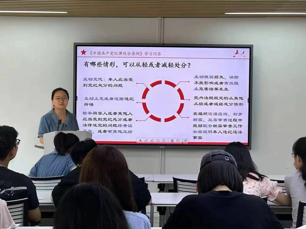 杨艺针围绕监督执纪“四种形态”、党员的纪律处分种类、从轻或减轻处分的情形、免于党纪处分的情形四个方面介绍了《中国共产党纪律处分条例》。她指出,青年党员要深入学习党的理论,坚定信仰,筑牢思想防线,将党的纪律内化于心、外化于行。