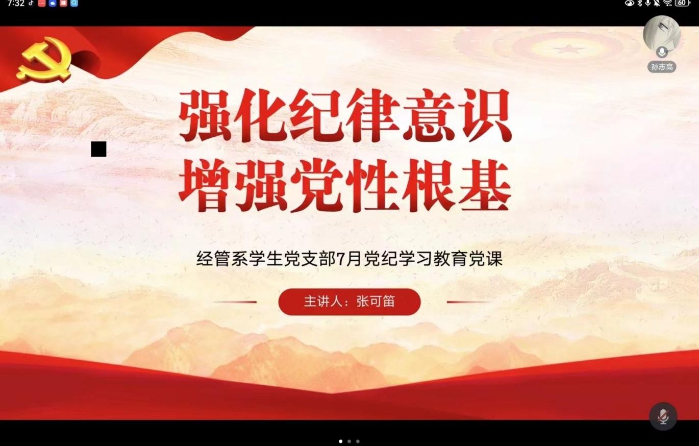 (记者 吴雨霏 李青云 刘艺杰)7月19日,公司经管系员工党支部通过线上会议形式开展以“强化纪律意识,增强党性根基”为主题的微党课。经管系员工党支部党员张可笛担任主讲人。