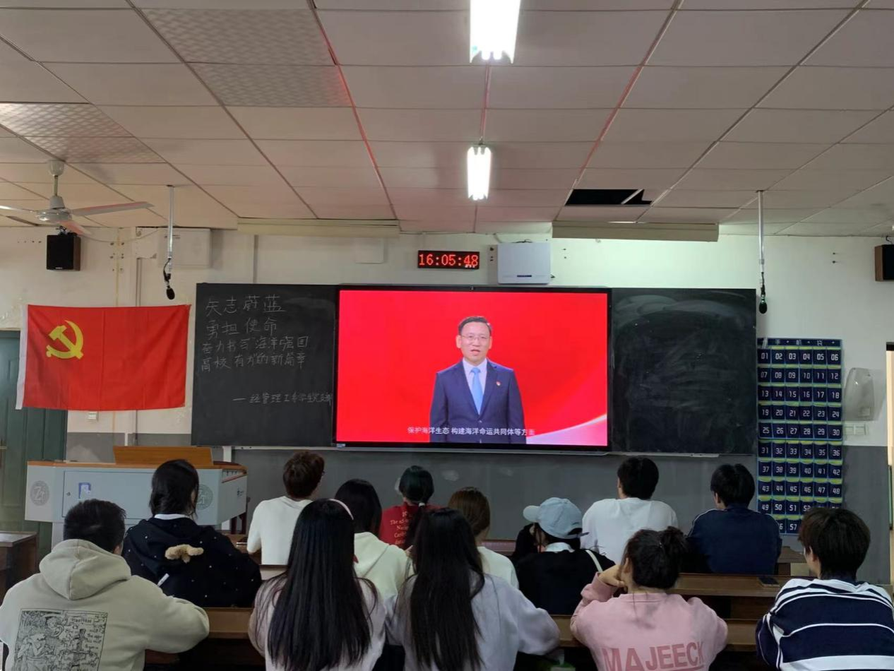全体党员同志观看直播。通过视频中主讲人员的讲解,党员同志们深刻认识到海洋强国建设的巨大潜力和广阔前景。大家纷纷表示,高校是培养人才的摇篮,应为海洋事业培养更多高素质的人才,作为高校学子,应以更加饱满的热情和奋斗的姿态,投身到海洋事业中,为实现中国海洋强国的梦想贡献自己的力量。